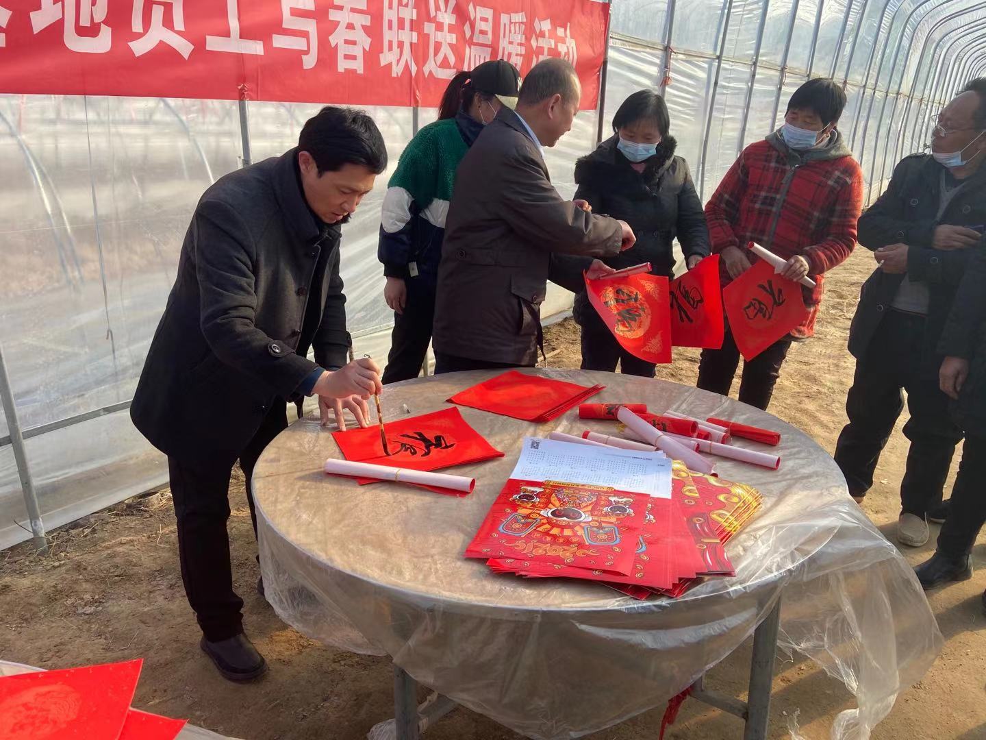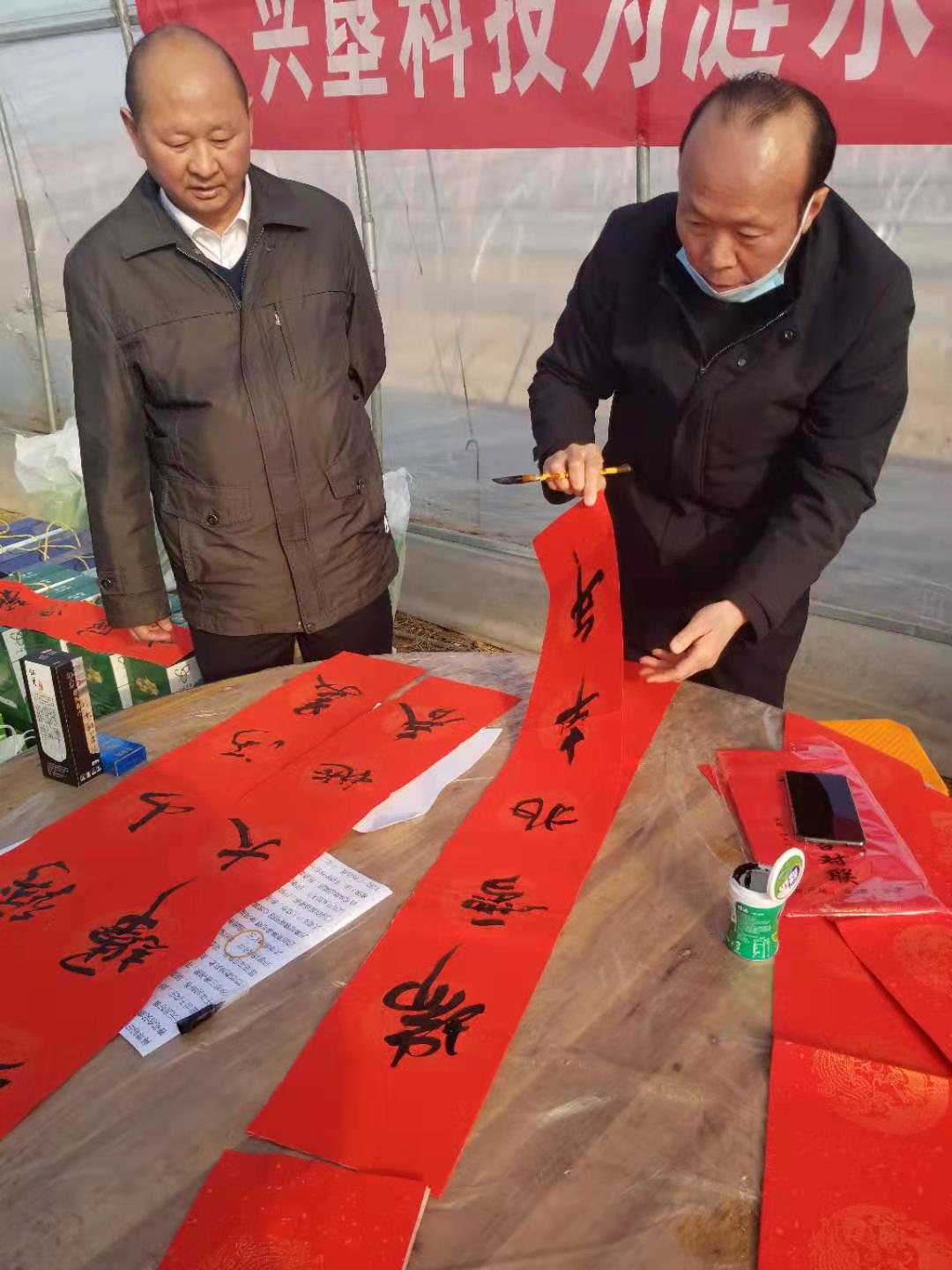 杨育清、马传武亲自挥毫泼墨,为村民写春联、送福气,“实干兴邦唱新曲、勤劳致富奔小康”一幅幅寓意吉祥的对联赠与村民,一句句真诚的祝福都寄托了辞旧迎新、接福纳祥的美好愿景。同时也给员工送去了精神食粮,受到当地村民一致好评,活动现场洋溢着欢乐祥和的过年气氛。