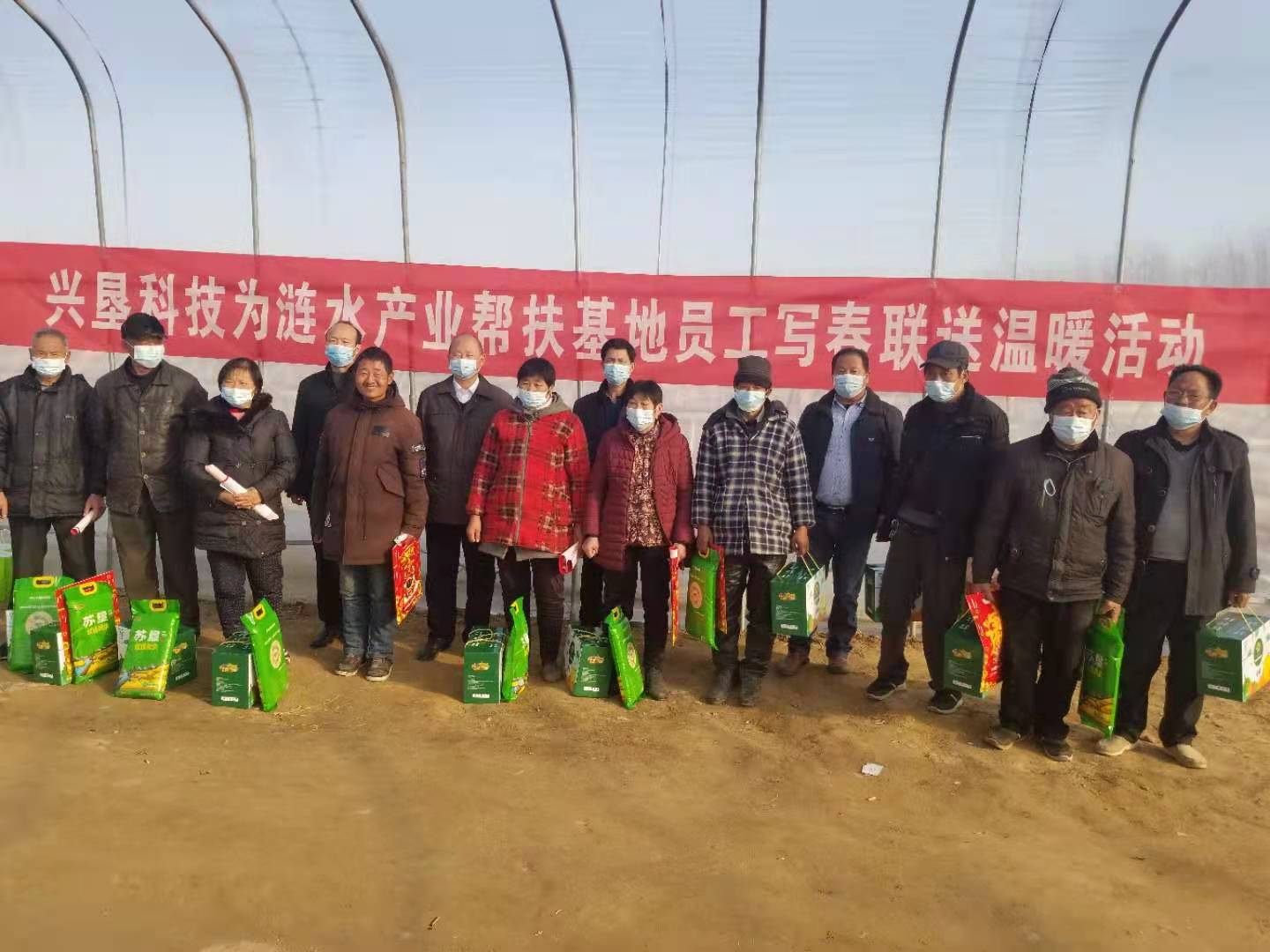 春节将至,帮扶情深。2021年2月4日下午,江苏JDB电子官网兴垦农业科技有限公司董事长、总经理陈丛林、副总经理杨育清、马传武一行到涟水产业帮扶基地开展写春联送温暖慰问活动,为基地村民送上组织的关怀和新年的祝福。涟水县林场村支部书记陈法宝一同参加慰问活动。