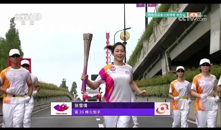 9月20日上午,杭州第19届亚洲运动会火炬传递杭州站起跑仪式在杭州城市阳台举行。前国家队击剑运动员,江心沙农场职工子女张雪倩作为39棒火炬手传递亚运精神。